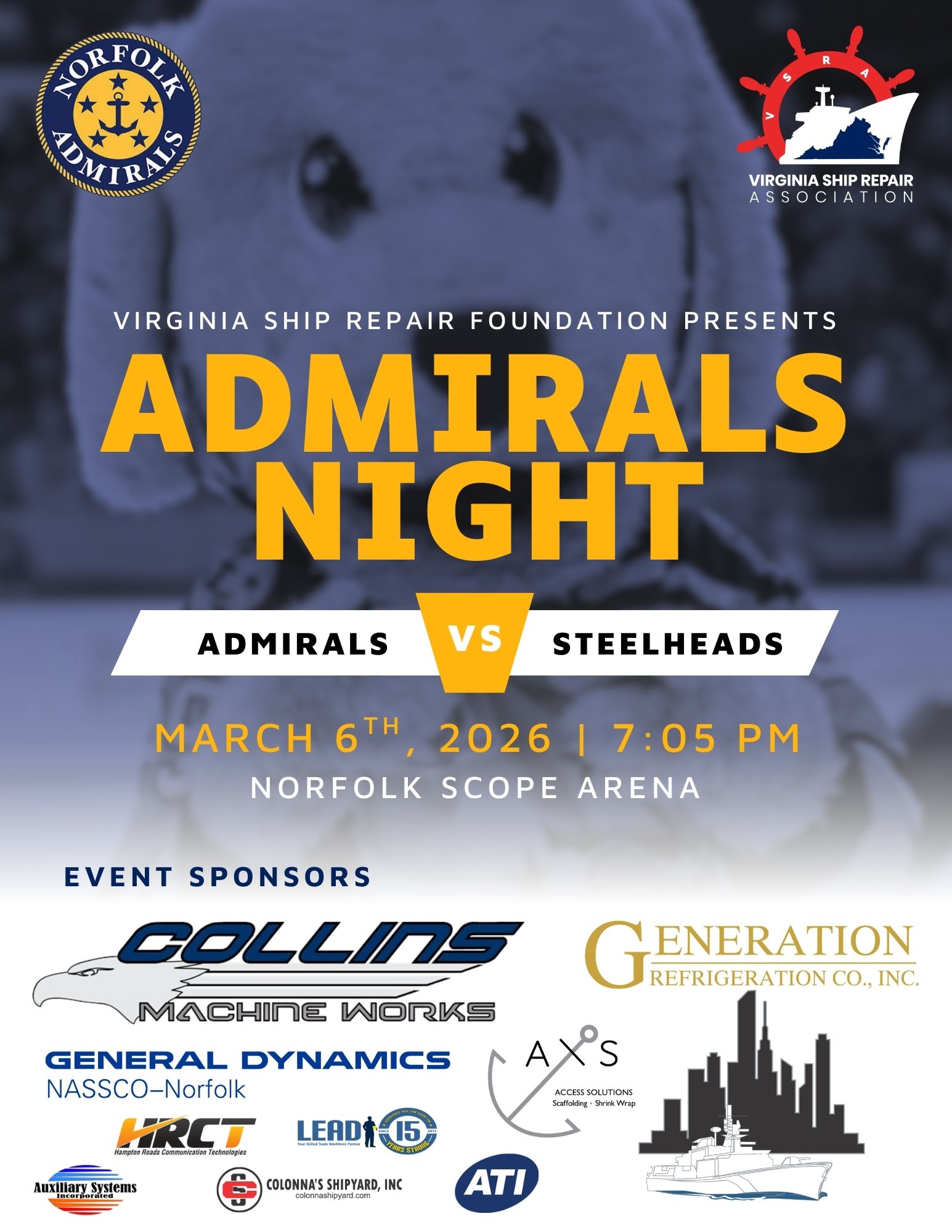 Join us for Admirals Night at the Norfolk Scope Arena is scheduled for Friday, March 6, 2025! Doors open at 6:05 and the game begins at 7:05 PM. Bring the whole family for a night of Admirals Hockey at the Scope Arena that's fun for all ages! The VSRA staff will be on-site with games, prizes, and information on the Ship Repair Industry. For more information, please contact the VSRA office at (757) 233-7034.